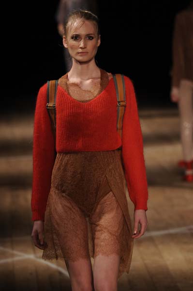 Já a New Order (linha de acessórios) apostou no balé o no militarismo ao mesmo tempo. Botas que lembram sapatilhas de balé e sandálias coturnos, simplesmente arrasaram. Outro desfile que eu adorei foi o da British Colony com o seu inverno colorido.